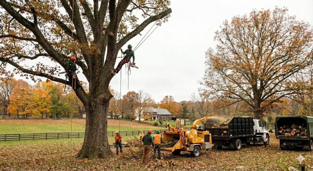Un chêne mature, à grande hauteur avec une ramification dense. L’accès difficile et la gestion soignée des masses de bois s’imposaient naturellement. Les contraintes techniques se multipliaient : la hauteur et l’envergure du chêne imposaient une progression par grimpe-élagage (ascension sur cordes), avec plusieurs points d’ancrage pour répartir les efforts. La densité des branches obligeait une progression méthodique pour éviter d’endommager la structure de l’arbre.